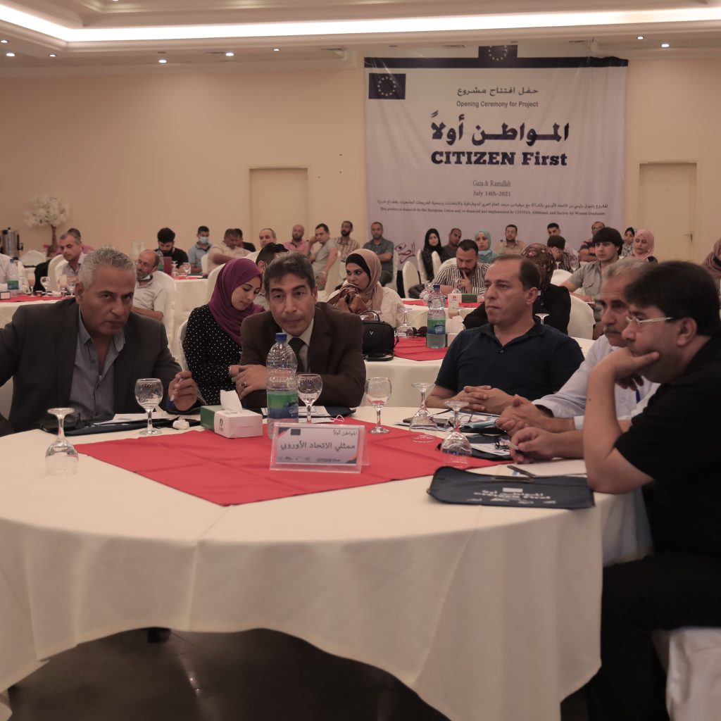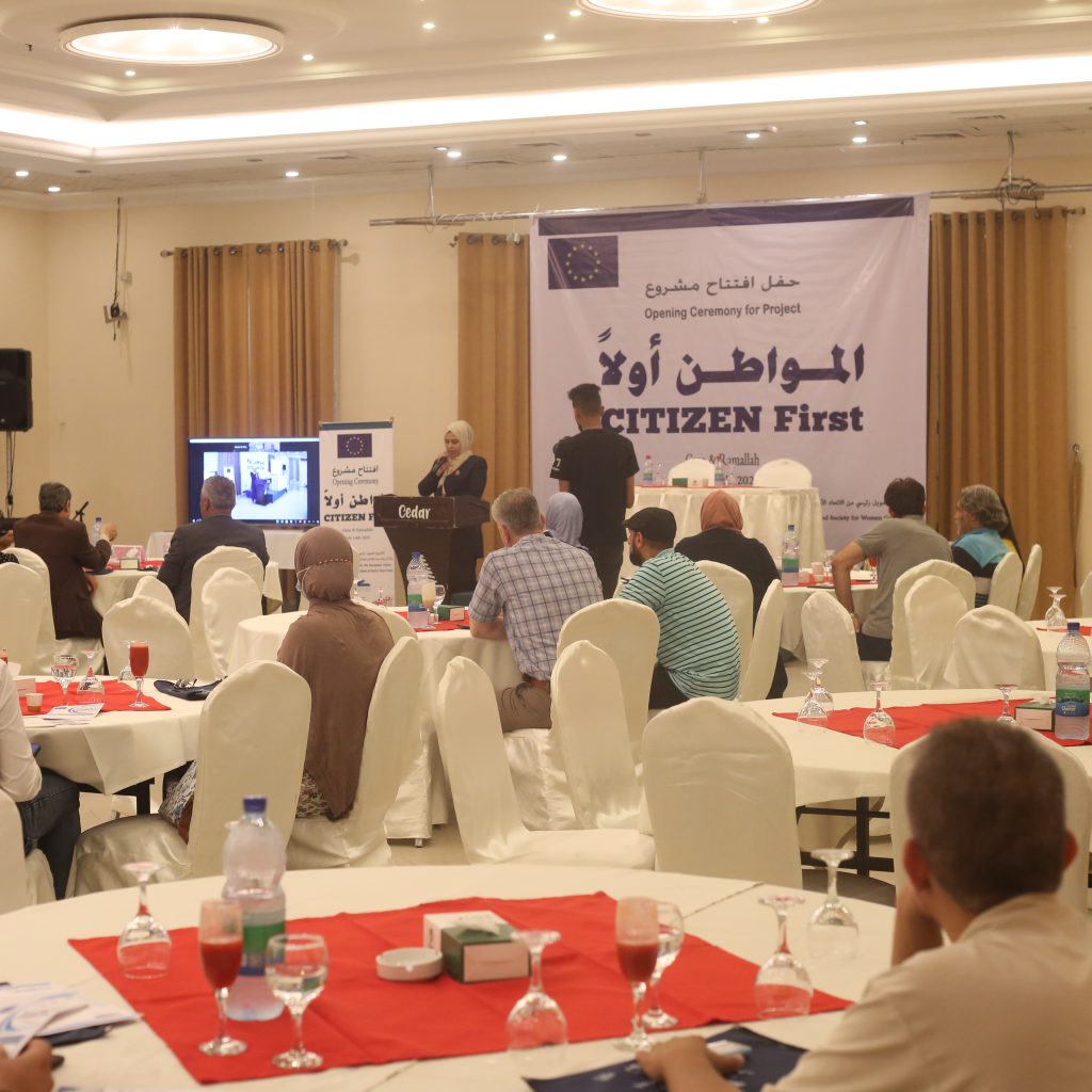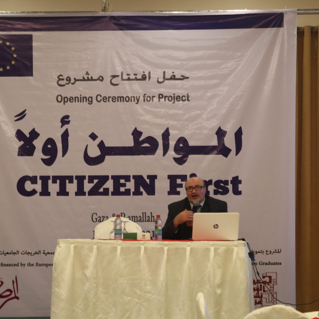 عقد مركز دراسات المجتمع المدني بالشراكة مع جمعية الخريجات الجامعيات بقطاع غزة وجمعية ” مرصد العالم العربي للديمقراطية والانتخابات” بالضفة الغربية ، بصفتهم أعضاء قياديين في التحالف المدني للديمقراطية وسيادة القانون، والمكون من 86 منظمة أهلية منتشرة في مختلف محافظات الوطن. حفل افتتاح مشروع المواطن أولـــــــاً، الممول بتمويل رئيسي من الاتحاد الأوروبي، بالتزامن مع شريكنا في الضفة الغربية بحضور نخبة من مؤسسات المجتمع المدني وممثلي الاتحاد الأوروبي في الضفة الغربية وغزة، حيث يهدف المشروع لتمكين المجتمع المدني الفلسطيني من لعب دورٍ وقوة فاعلة من أجل الإصلاح الاجتماعي، والاقتصادي والسياسي عبر تعزيز عملية وثقافة المساءلة في المجتمع الفلسطيني، بما يشمل تعزيز أدوار كل من المجتمع المدني والفاعلين الاجتماعيين بالإضافة لحاملي المسئولية، عبر تحسين استجاباتهم لمطالب جماهيرهم من المواطنين أصحاب الحقوق؛ وتمكينهم من الإيفاء بمسؤولياتهم والتزاماتهم بصفتهم أصحاب الواجب؛ حيث أن المشروع تم تصميمه وبنائه بالاعتماد على النهج القائم على الحقوق.